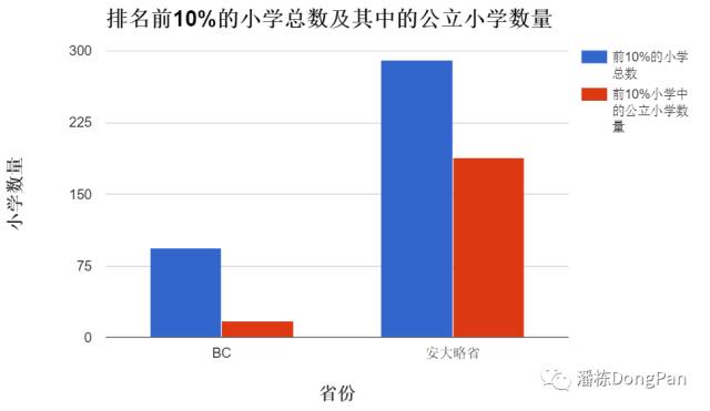 根据Fraser Institute 2015年的学校排名,在BC省排名前10%的中学里仅13.6%是公立中学,而在安大略省排名前10%的有62%是公立中学;在小学方面,BC省排名前10%的仅有18%是公立,而在安大略省,排名前10%的小学中有64.8%是公立小学。BC省私立小学每年的学费大约在1万多加币,私立中学则在2万加币左右,这也意味着,BC省的公校教育质量远低于私校,如果BC省的家长希望孩子收到更好的教育,就不得不付高昂的学费让孩子入读私立学校。